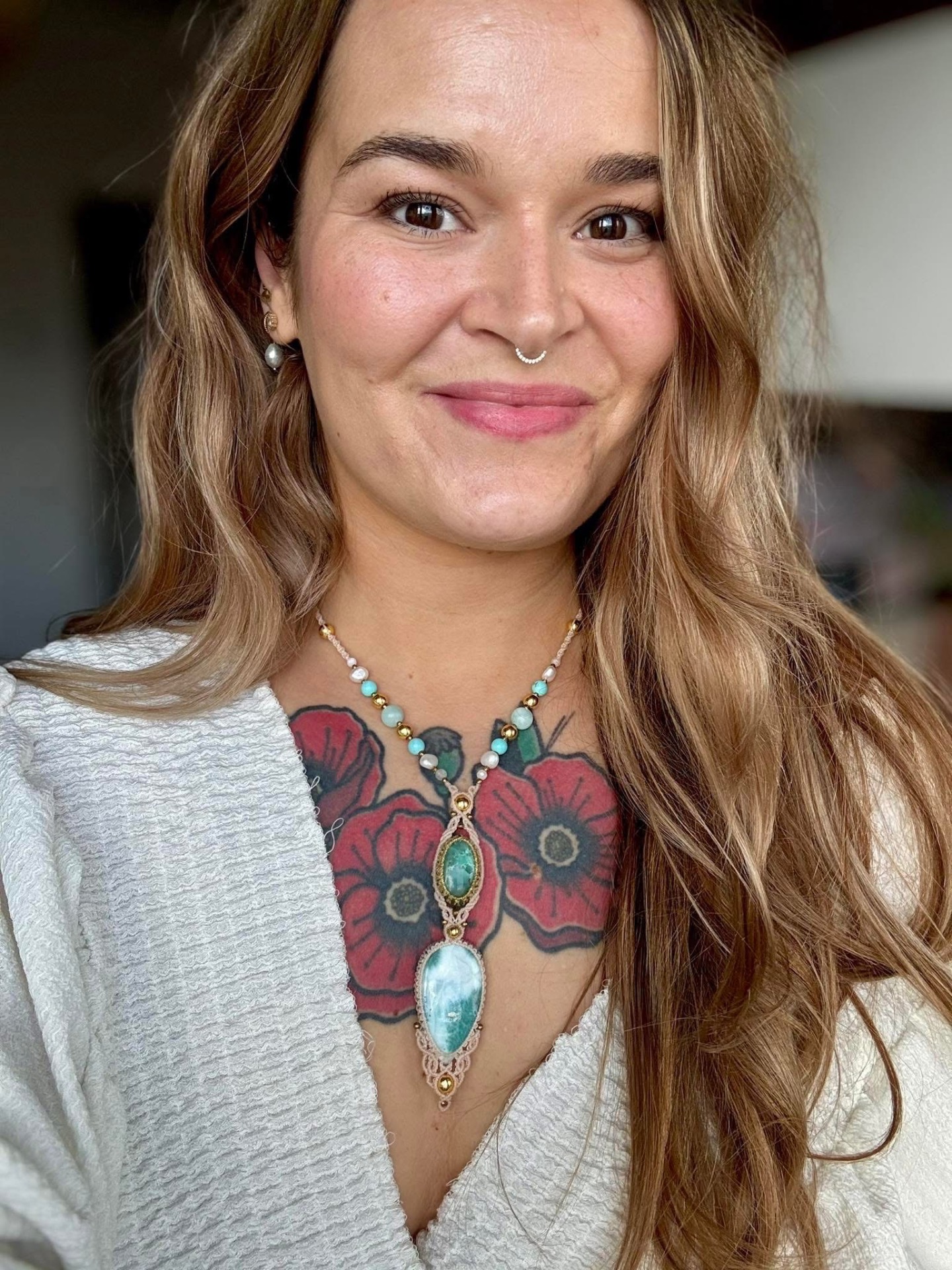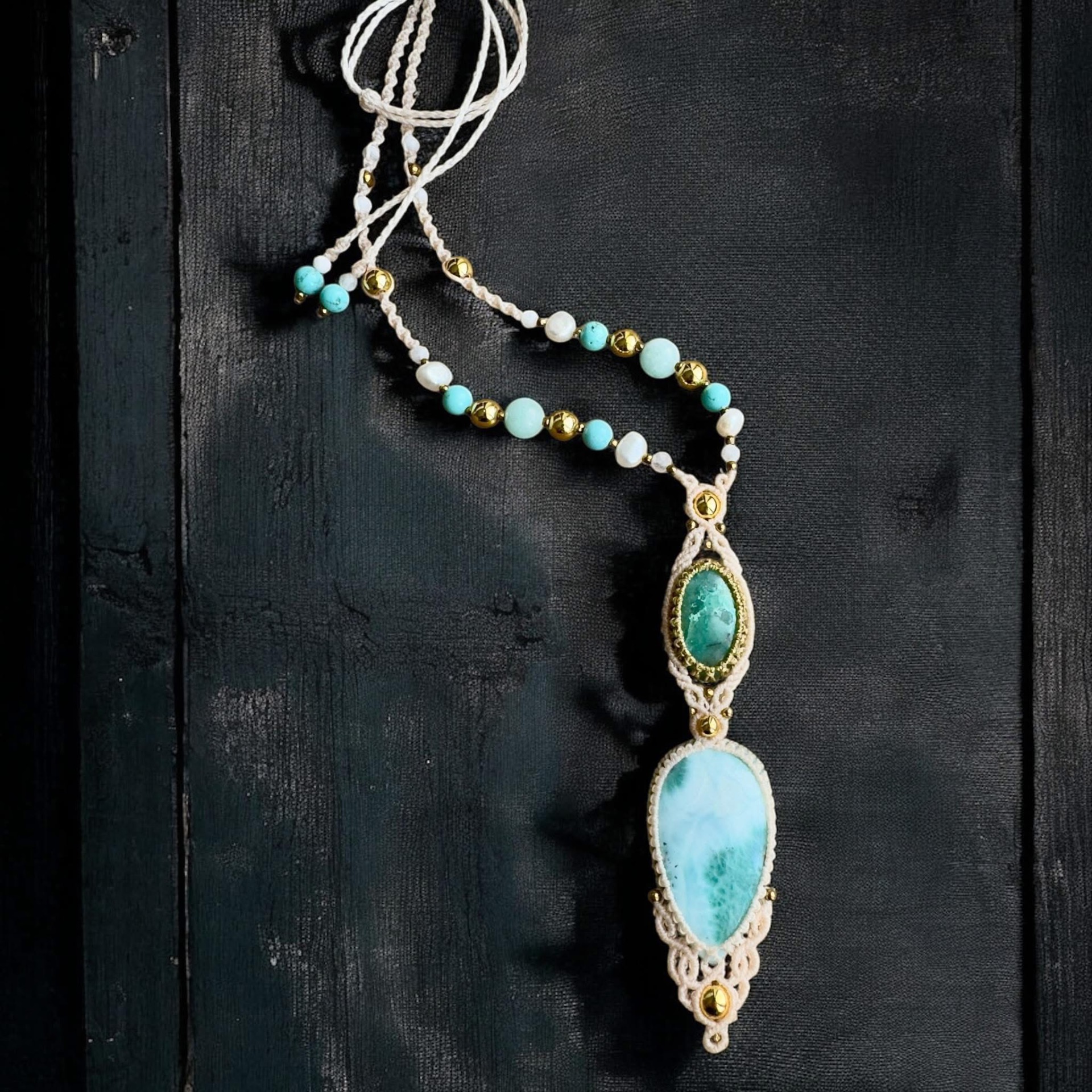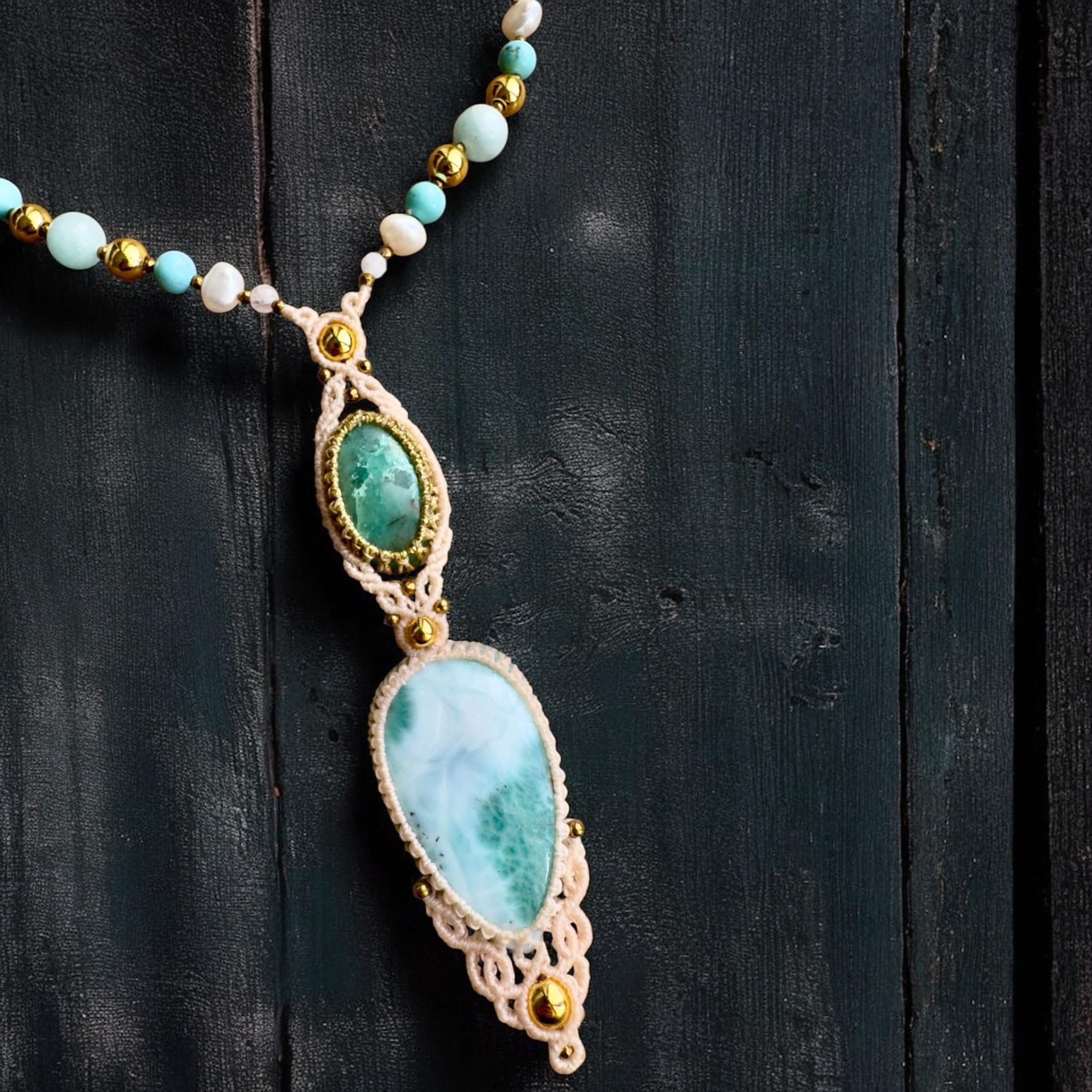 Luxusní náhrdelník s CHRYZOKOLEM a LARIMAREM, korálky z minerálů a říčních perel, v krémovém opletení.