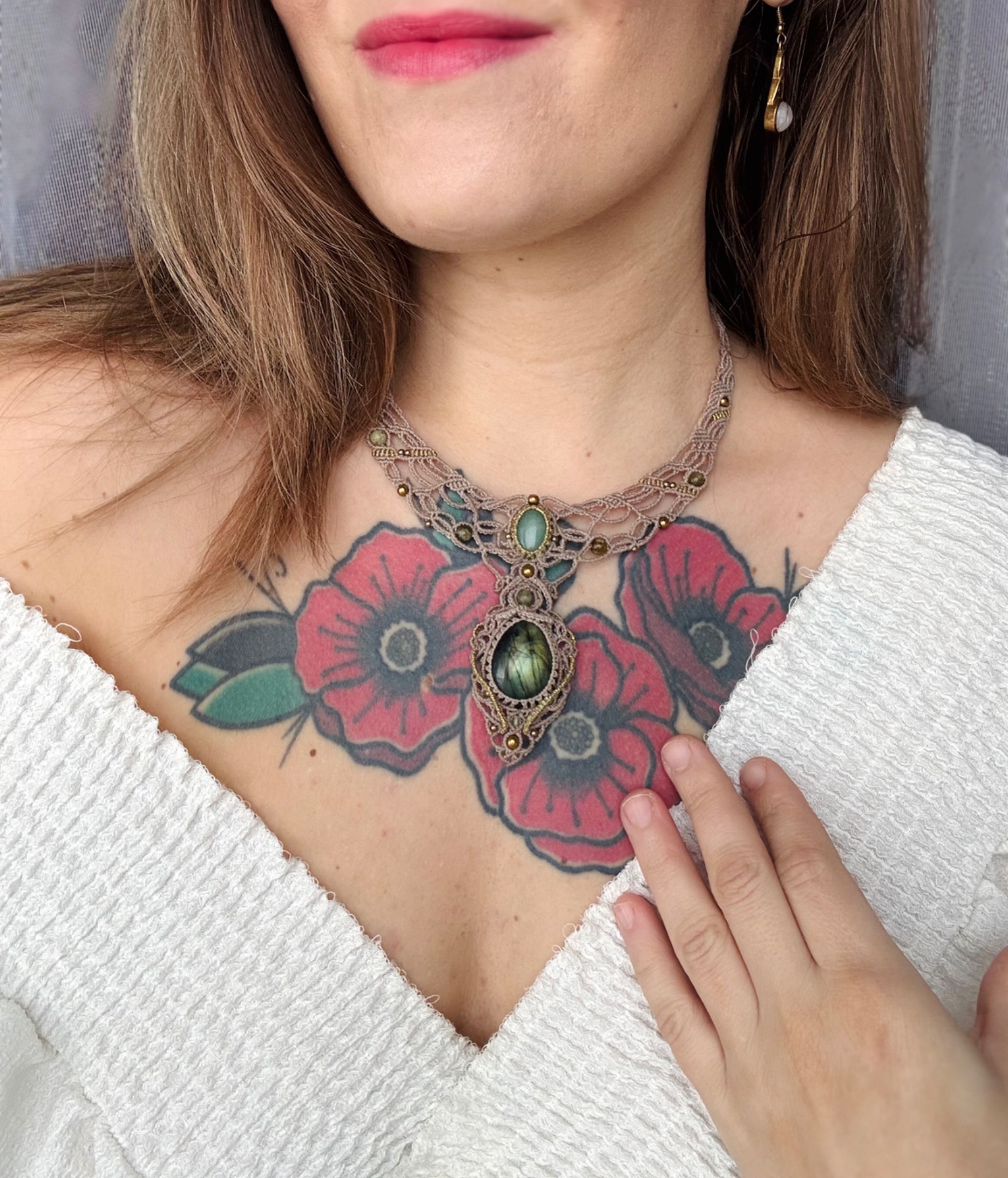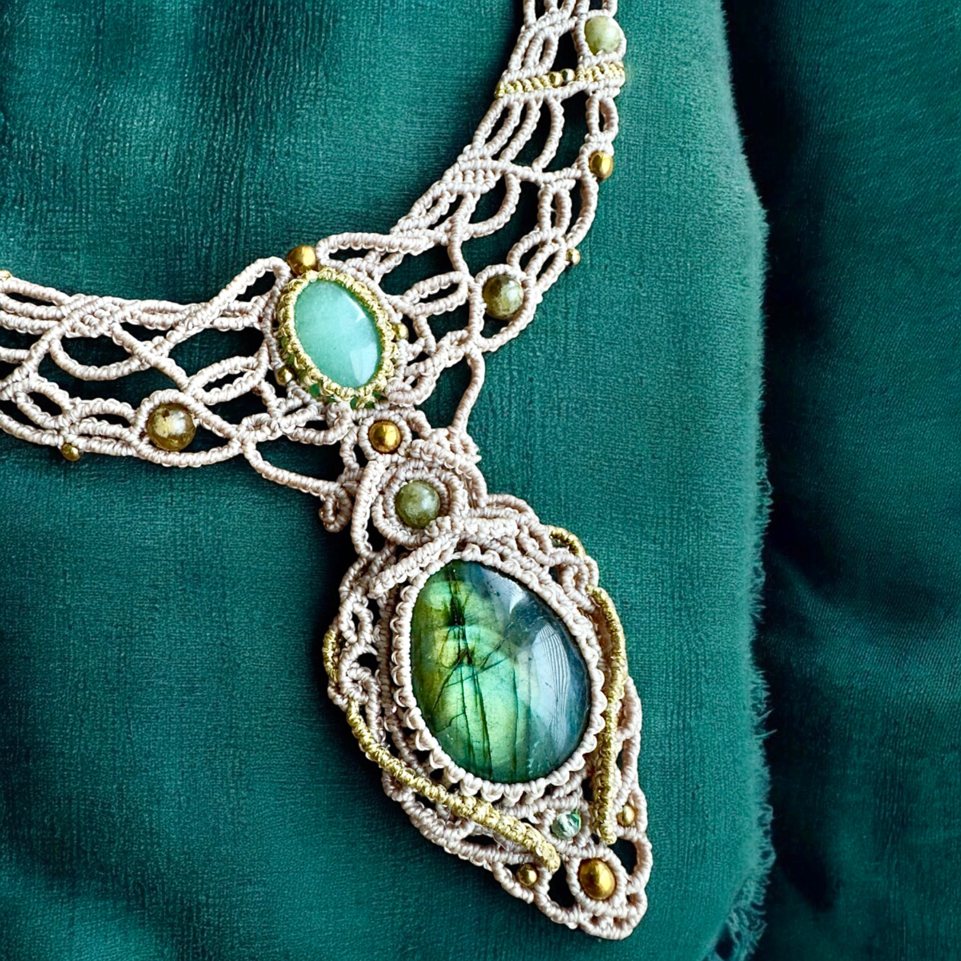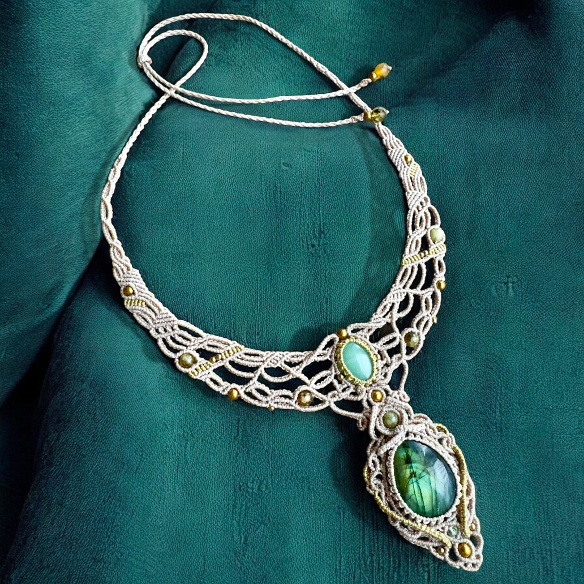 Žensky jemný náhrdelník s JADEITEM , ZELENÝM LABRADORITEM a korálky z minerálů.Odstín opletení je šedo-béžový.