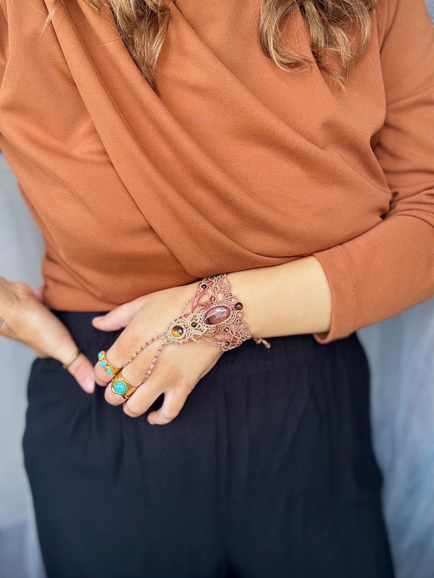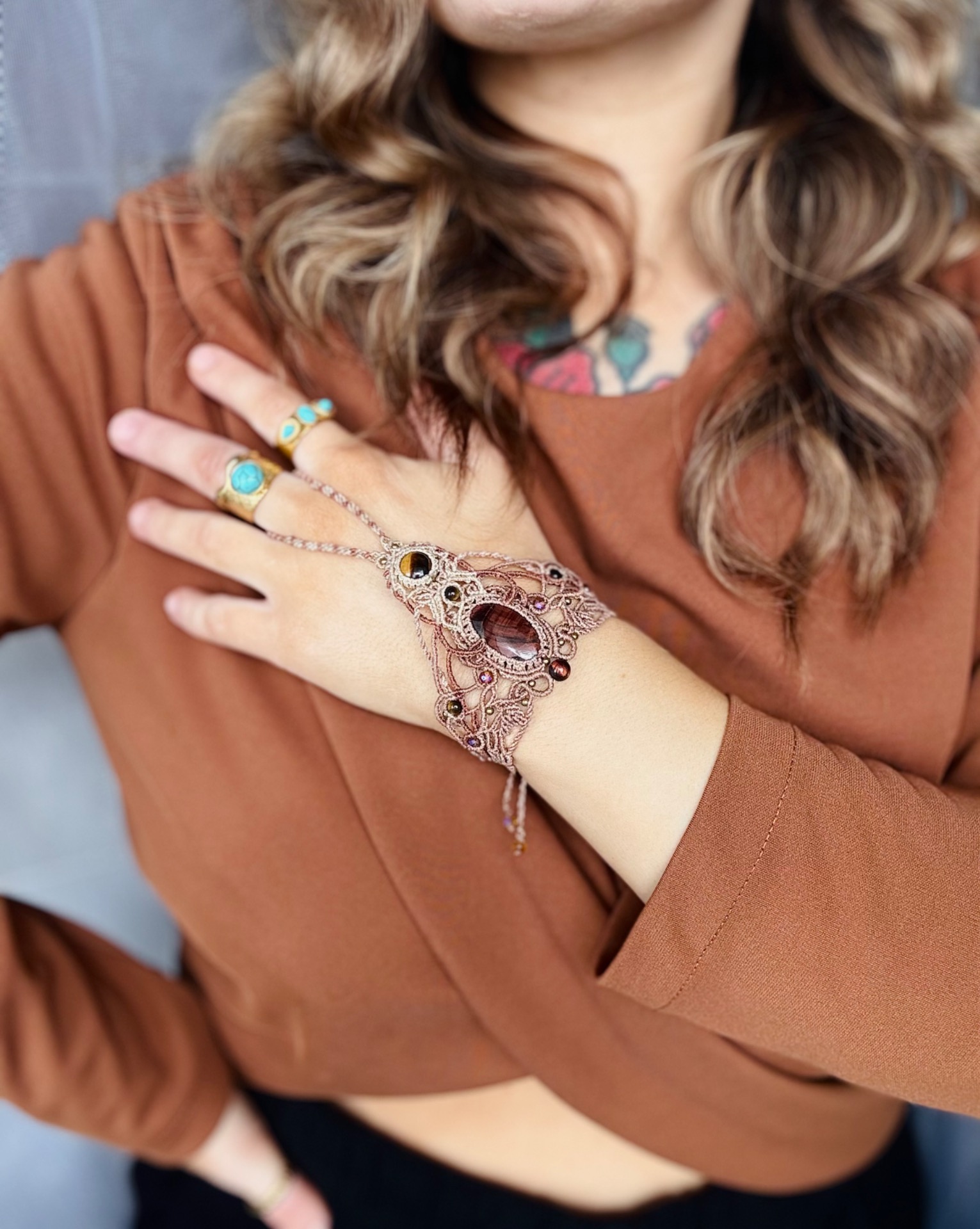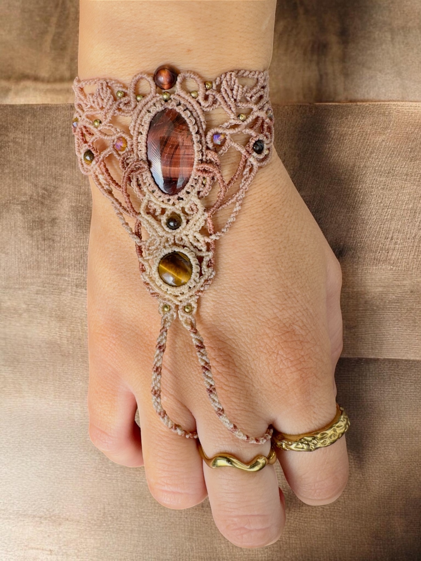 Prstový náramek s BÝČÍM OKEM, TYGŘÍM OKEM a korálky z minerálů a skla.Jemný, ženský kousek v teplých béžových tónech. Bez kovu.Vhodný pro obvod zápěstí od 15 cm.
