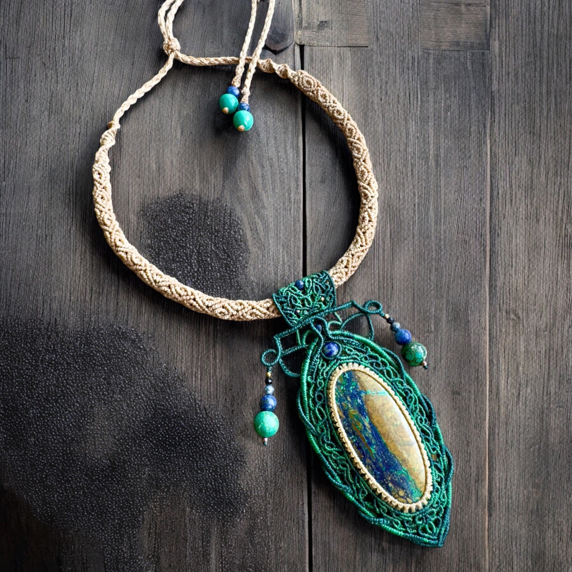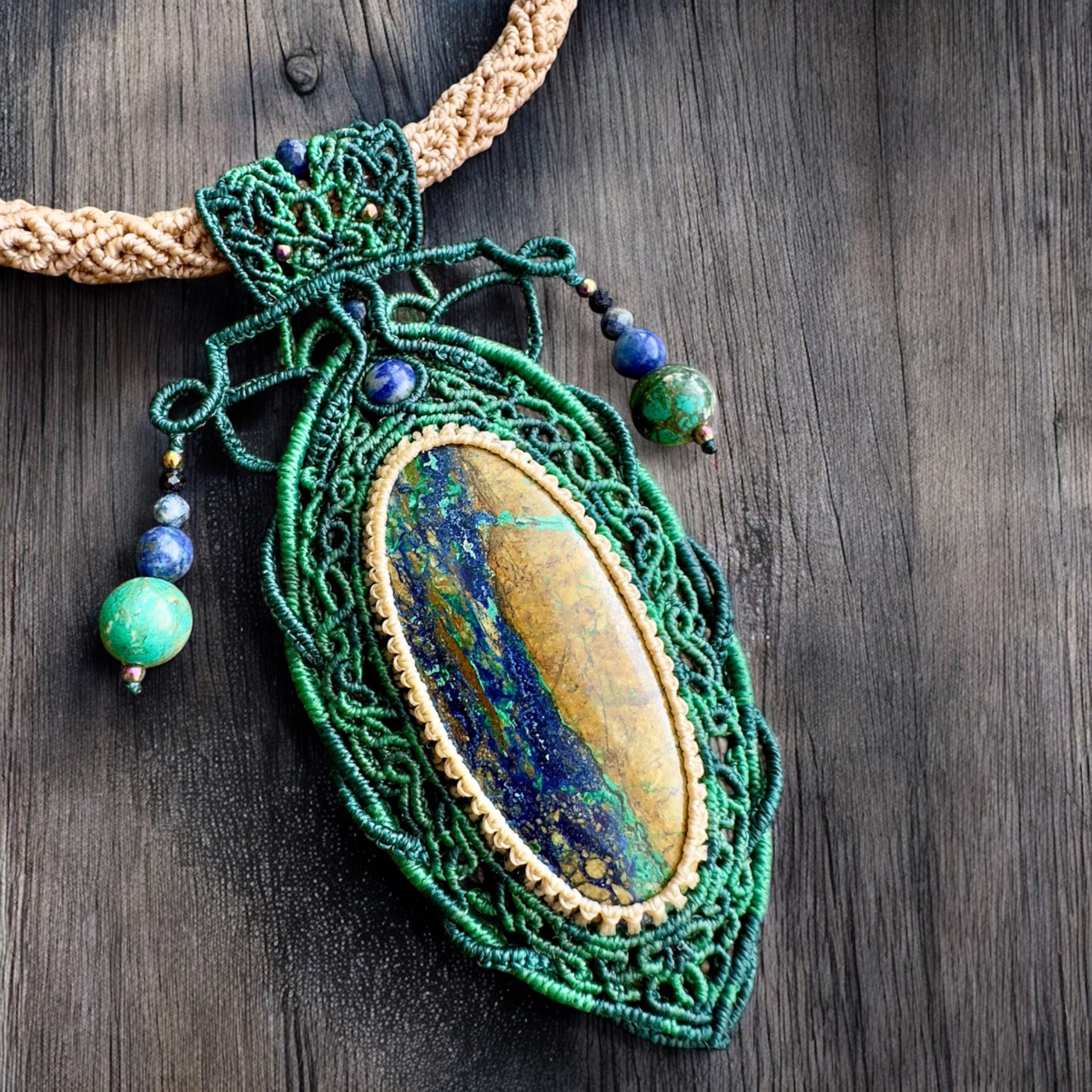 Náhrdelník s obrovským AZURIT-MALACHITEM ( 6 cm ) a korálky z minerálů, v zeleno-béžovém opletení.