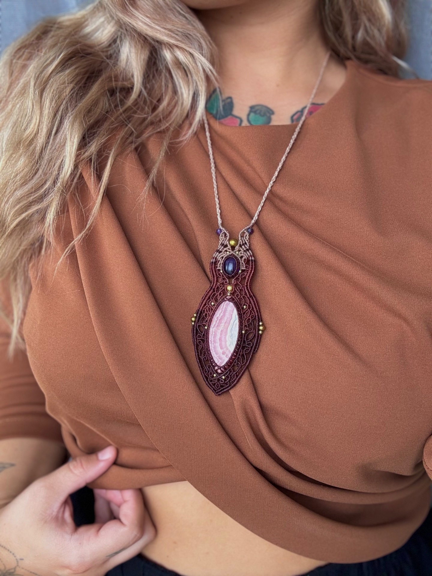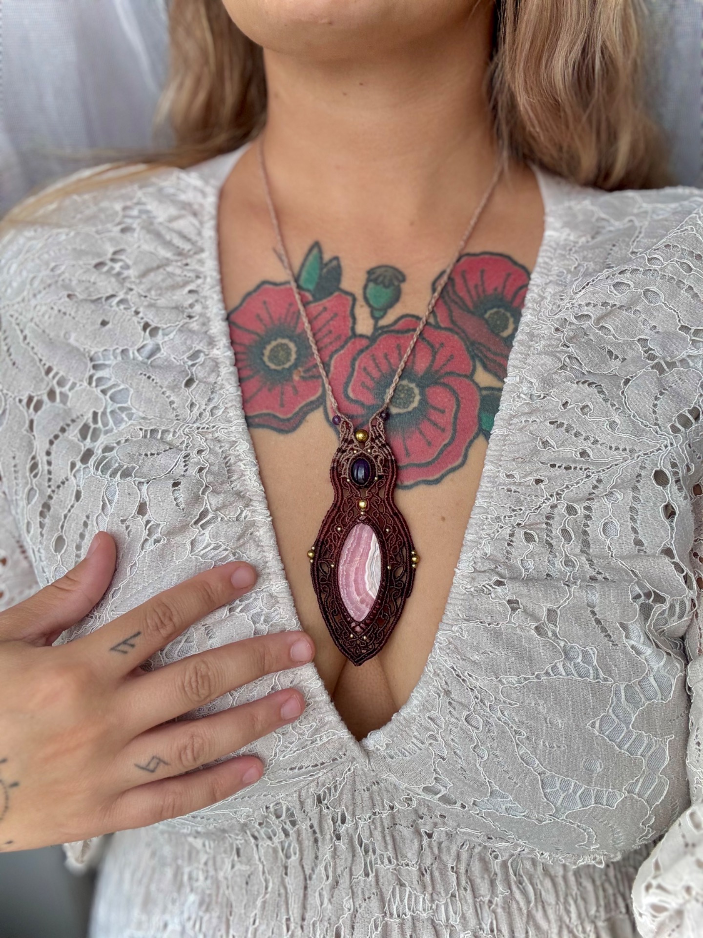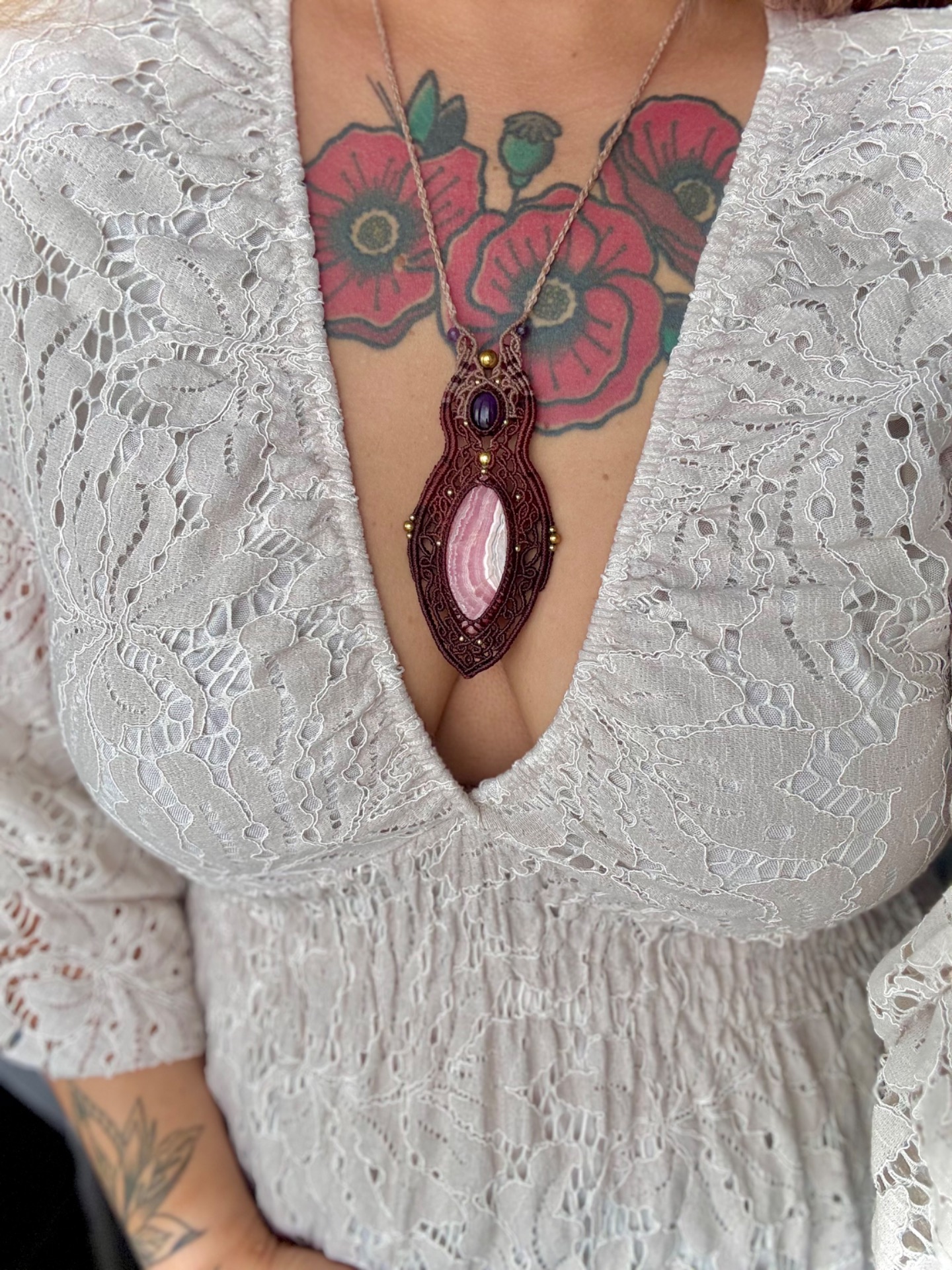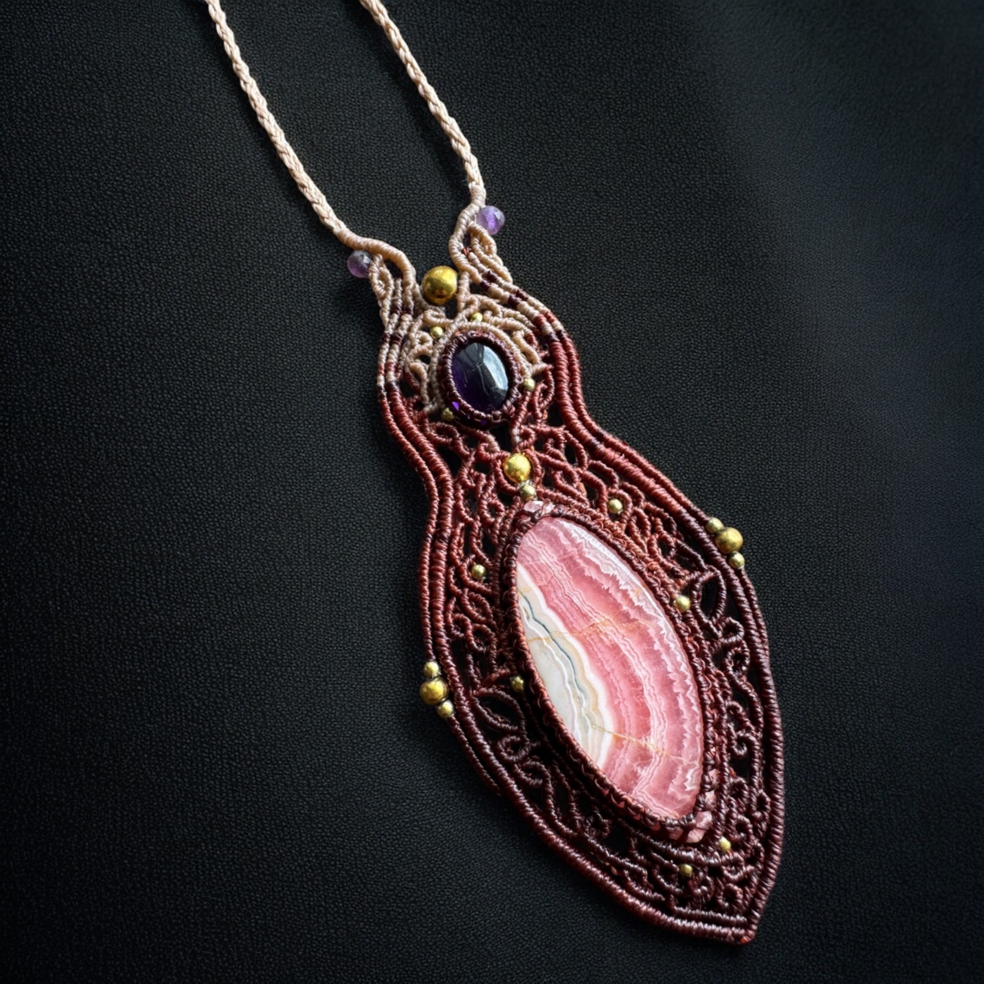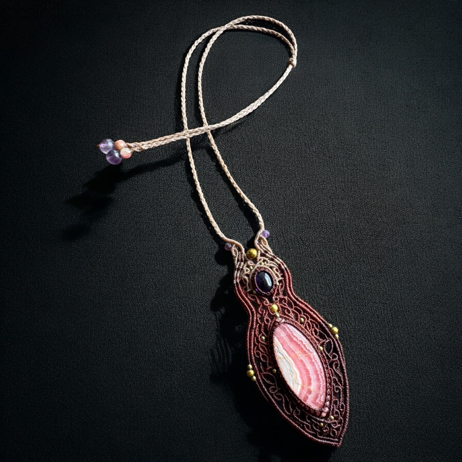 Amulet/ Náhrdelník s RODOCHROZITEM a AMETYSTEM v kaštanovém opletení a s korálky z hematitu a ametytu.