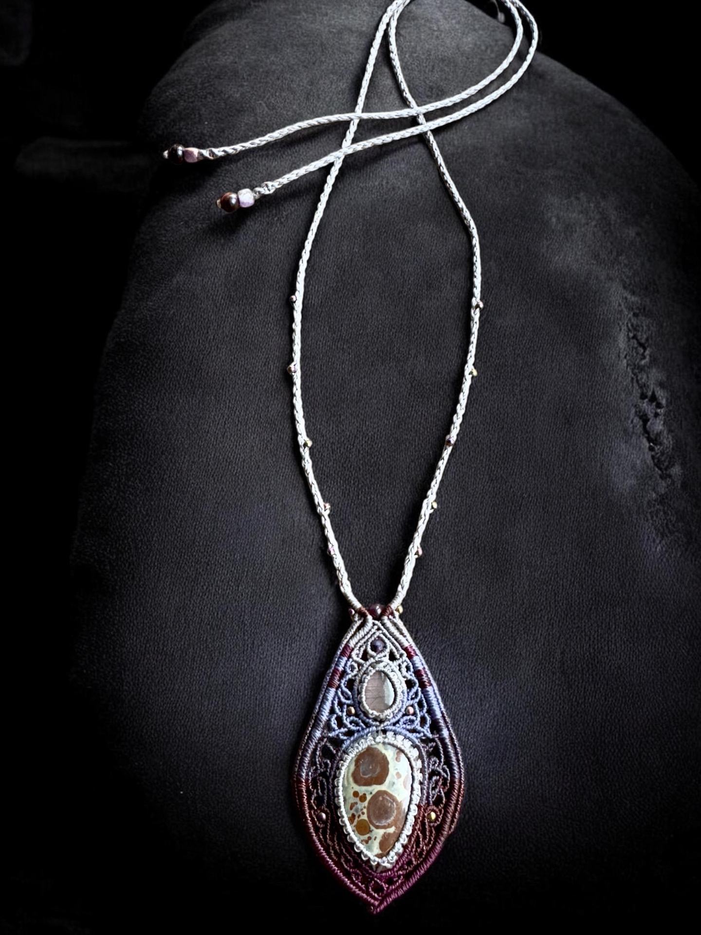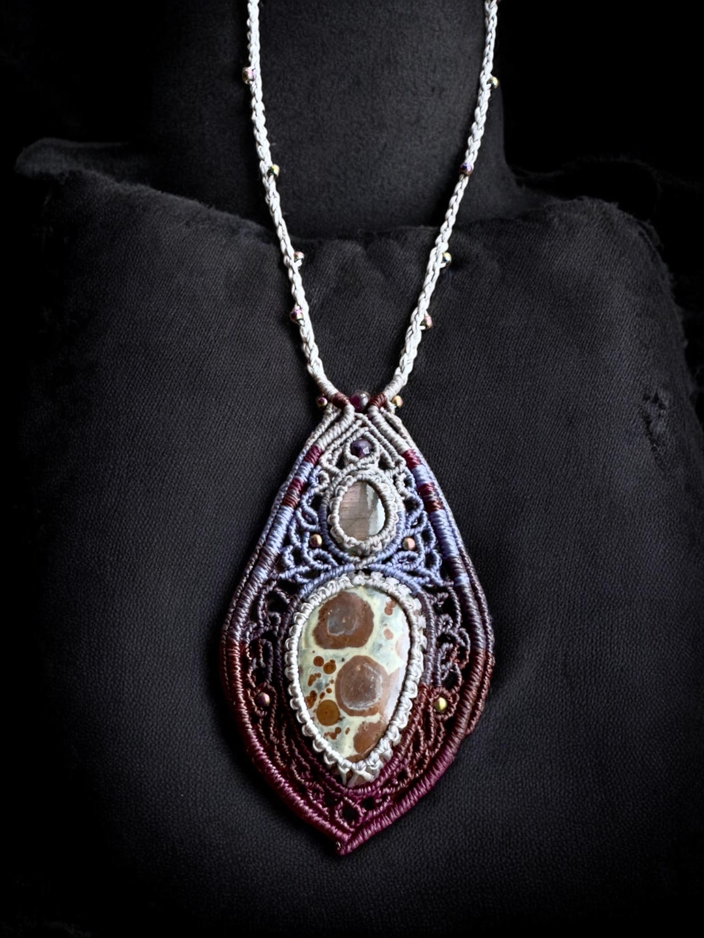 Amulet/ Náhrdéník s LABRADORITEM a JASPISEM. Doplněný o korálky z minerálů (hematit, ametyst a býčí oko. Délka přívěsku je 7,5 cm.Žádný kov.