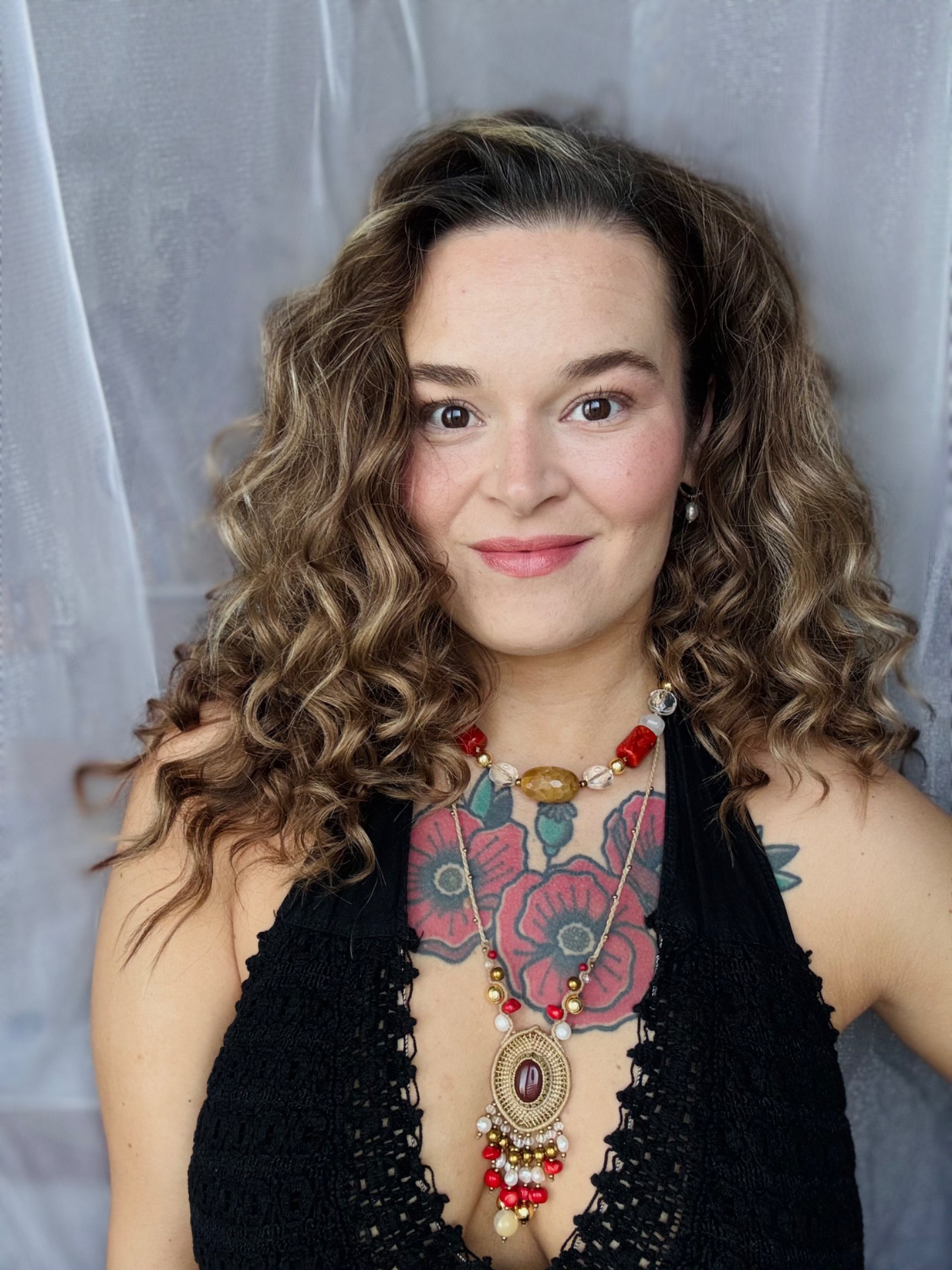 Boho náhrdelník s korálky z minerálů a skla. Délka náhrdelníku je 47 cm.Vhodný pro alergiky, bez kovu. Mezi každým korálkem je uzlík, který zabraňuje roztržení náhrdelníku.