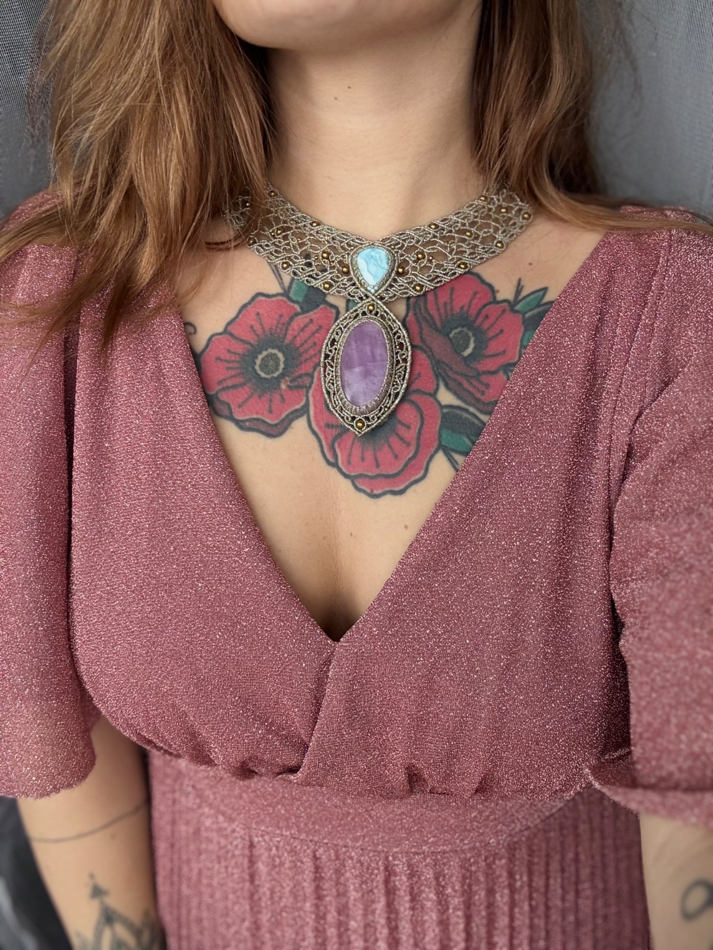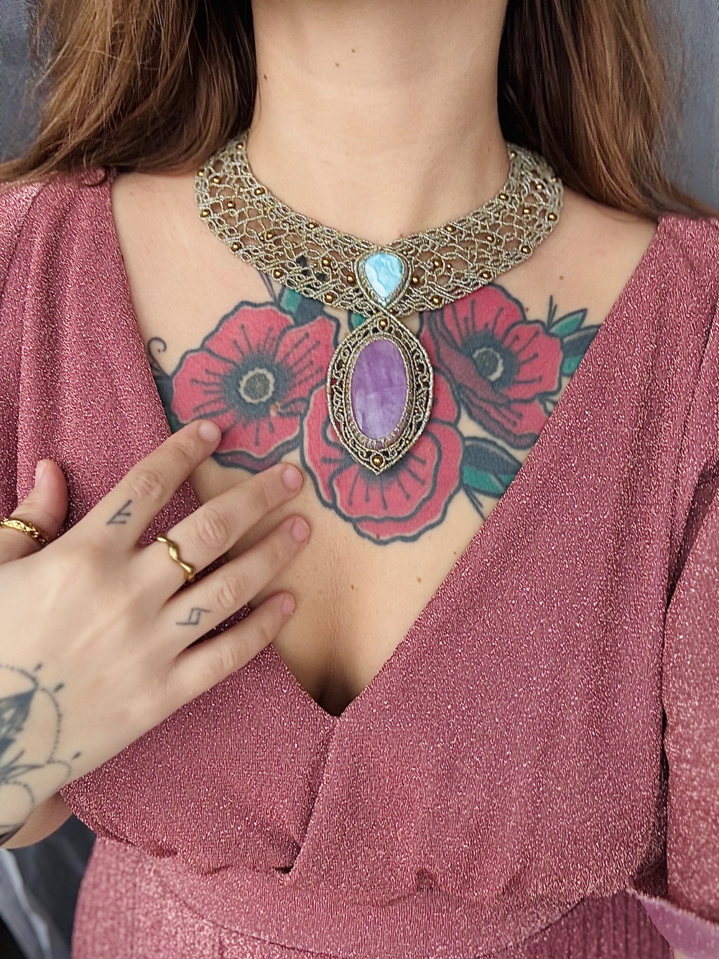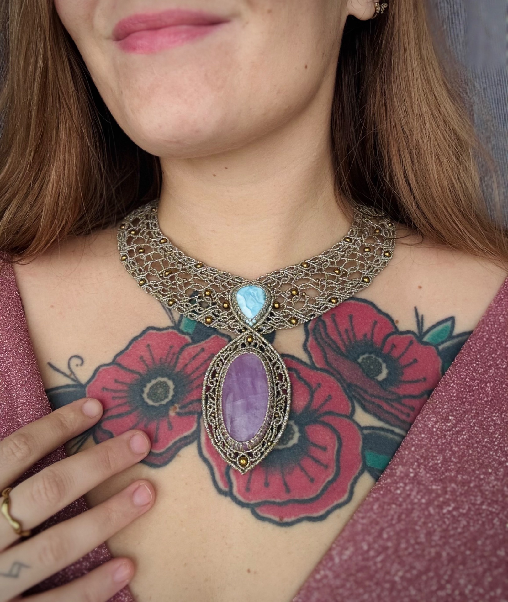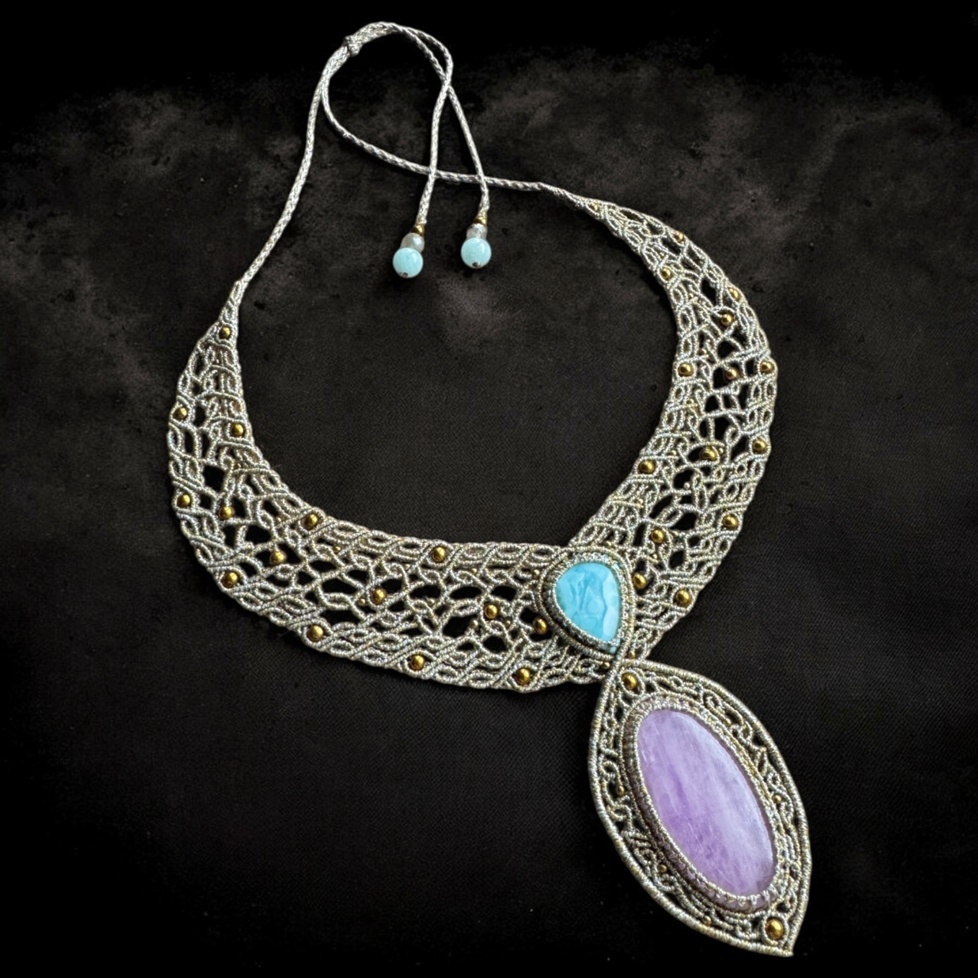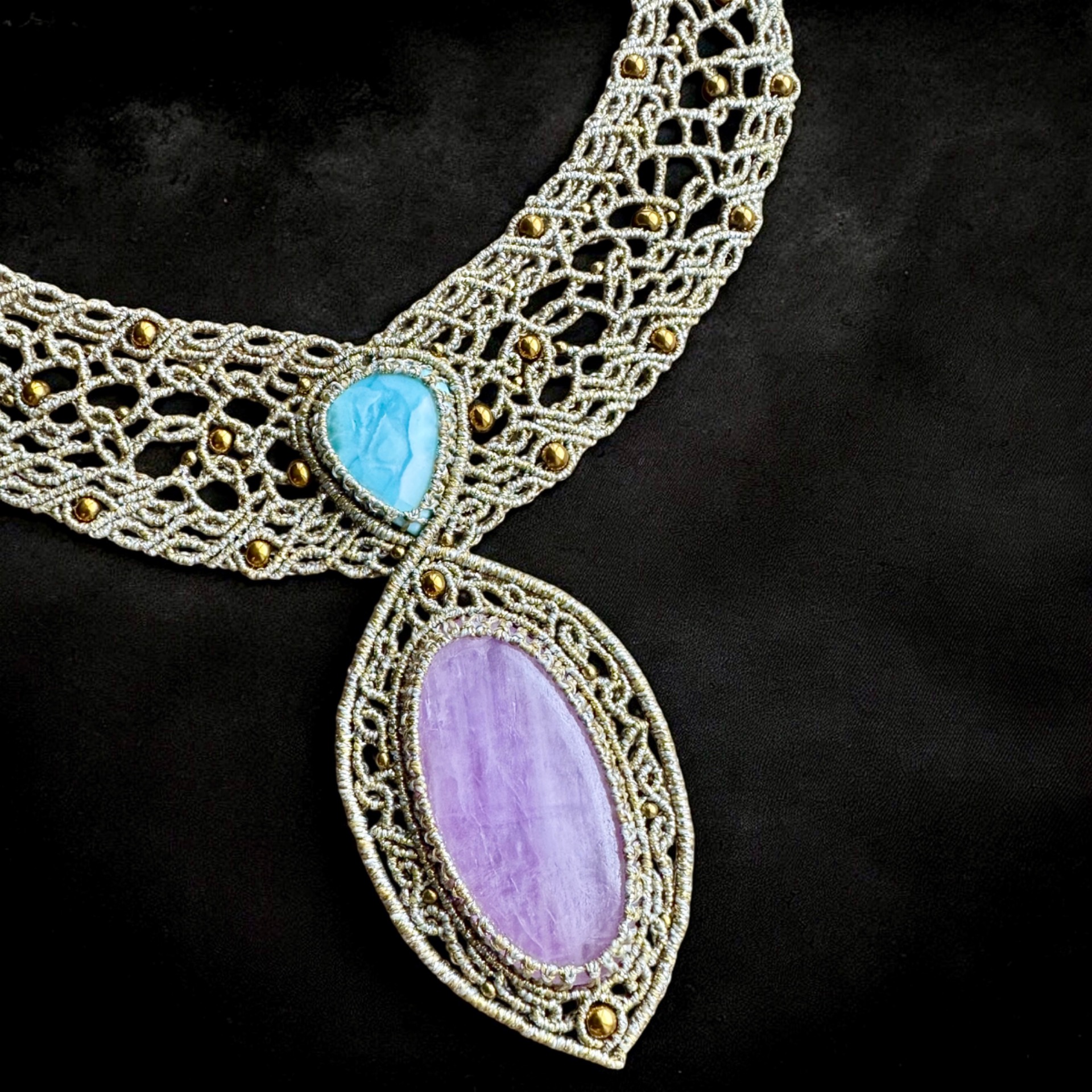 Zlato-stříbrný náhrdelník s LARIMAREM a obrovským ( 5 cm ) KUNZITEM, doplněný o korálky ze zlatého hematitu.