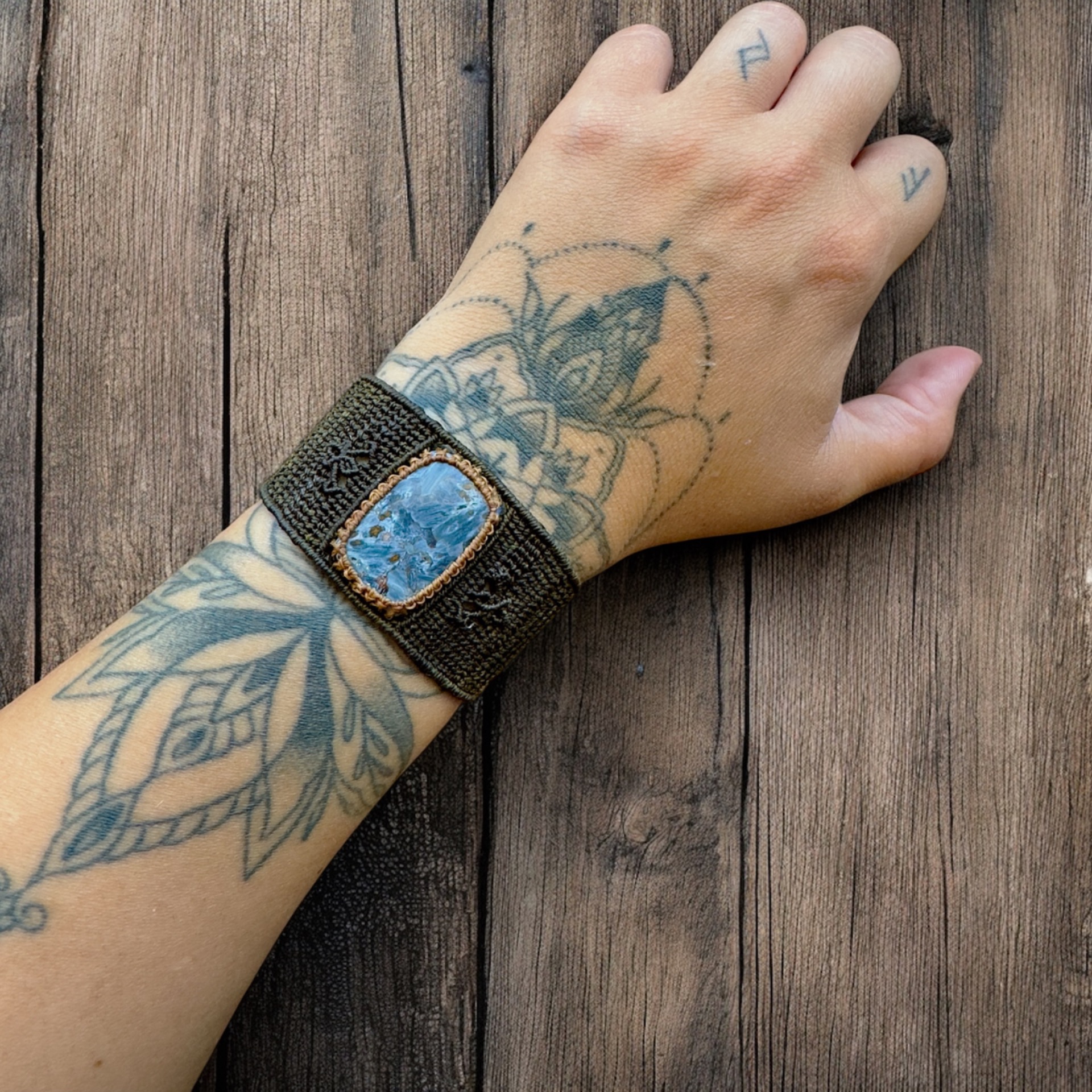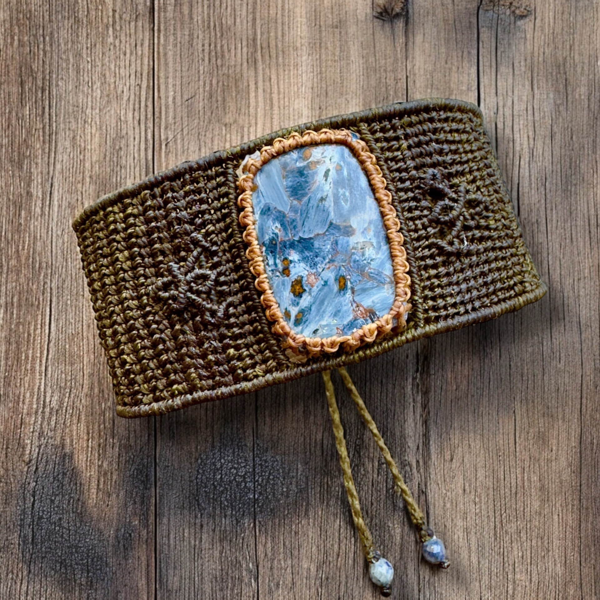 Náramek s živelným PIETERSITEM, kamenem bouří. V khaki opletení. Ukončen korálky z lapisu lazuli.
