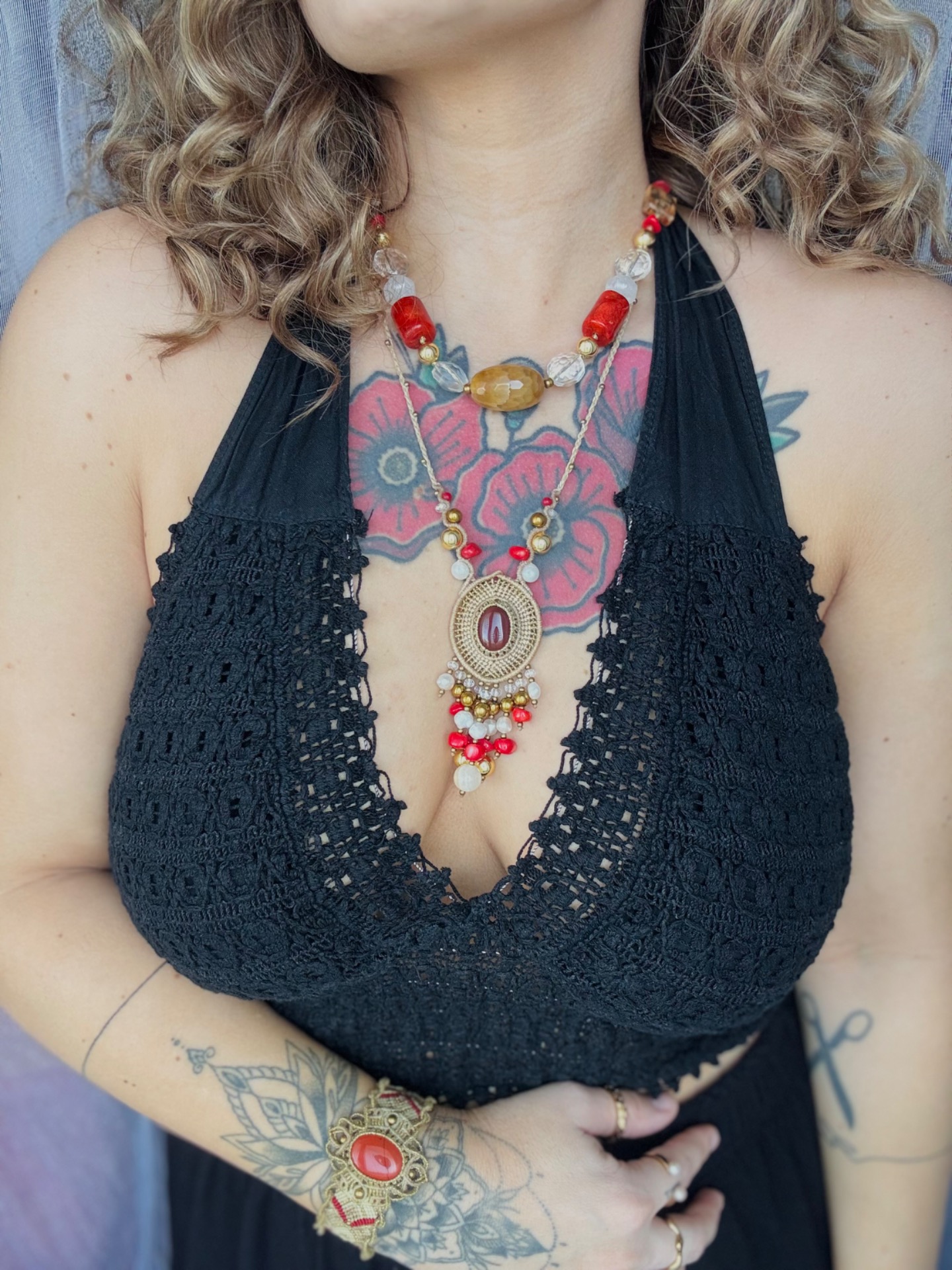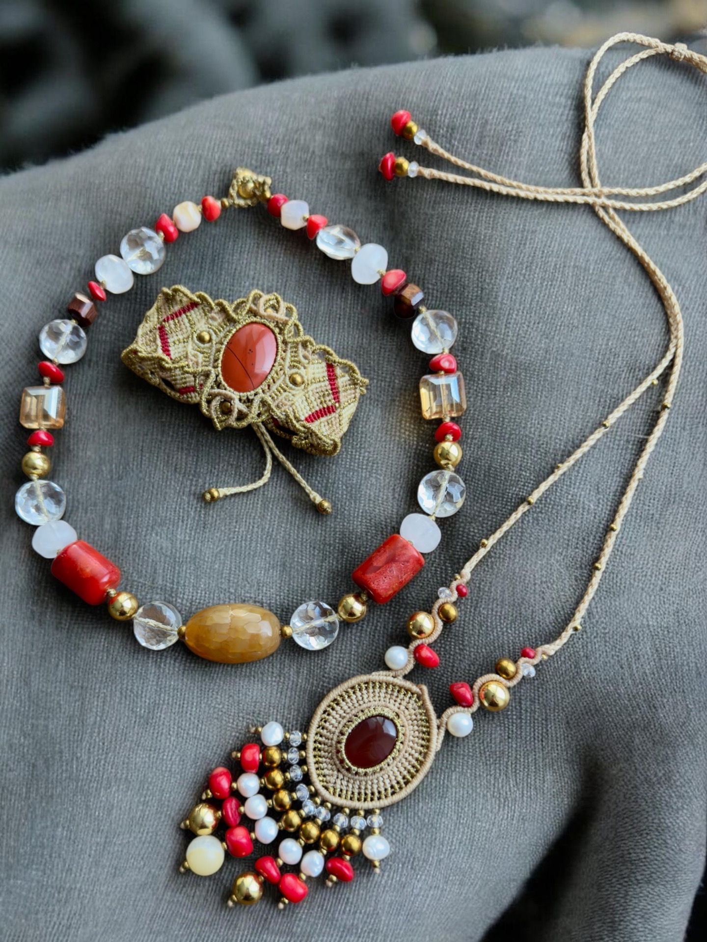 Náramek s červeným jaspisem a korálky ze zlatého hematitu.Vhodný pro obvod zápěstí od 16 cm.Šíře náramku v nejširším bodě je 4,5 cm.Žádný kov.