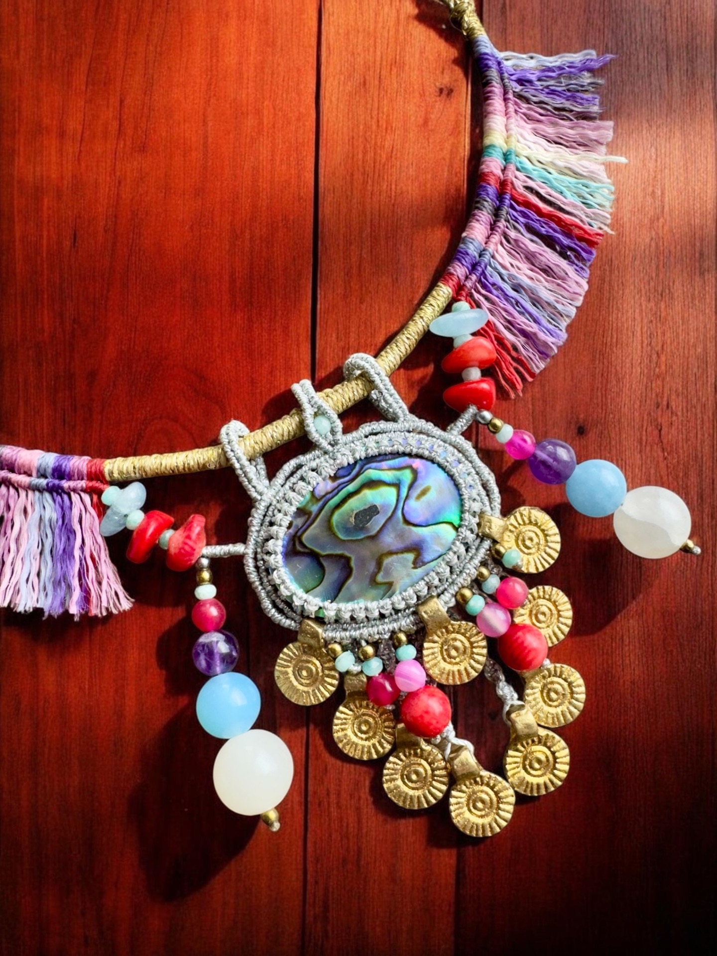 Mušle PAUA ( Abalone ), mosazné přívěsky spousta korálků z minerálů.
